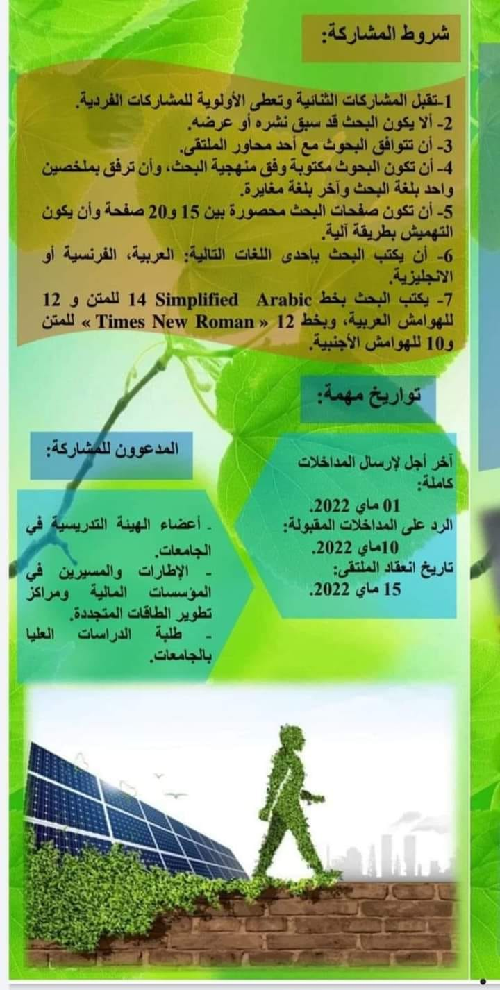 2022-05-15 الملتقى العلمي الوطني الافتراضي الأول حول التمويل الأخضر في الجزائر نحو تمويل داعم لمشاريع الطاقة المتجددة ومساهم في التنمية المستدامة - الجزائر