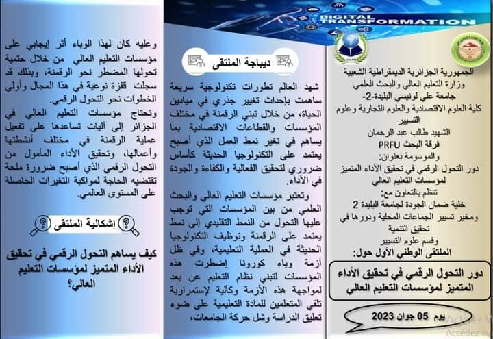 2023-06-05 الملتقى الوطني الأول حول دور التحول الرقمي في تحقيق الأداء المتميز لمؤسسات التعليم العالي - الجزائر