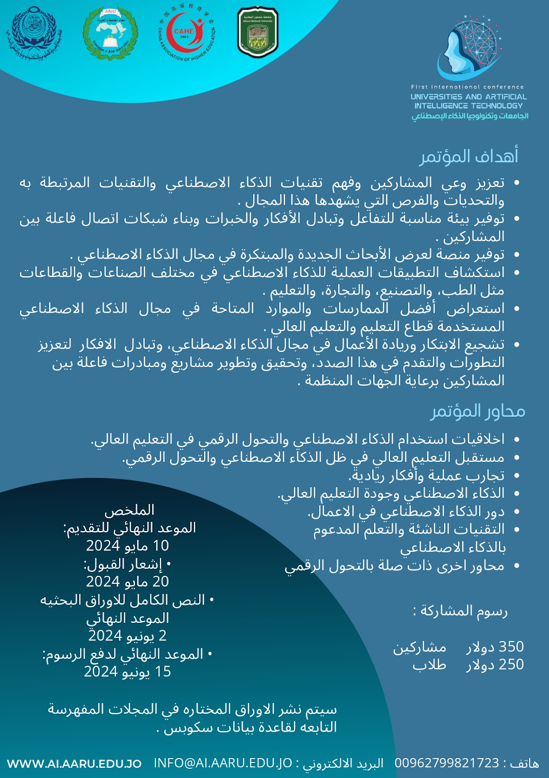 المؤتمر الدولي الأول بعنوان "الجامعات وتكنولوجيا الذكاء الاصطناعي" " Universities and Artificial Intelligence Technology" وذلك خلال الفترة من 25/6/2024- 24 في عمان بالمملكة الأردنية الهاشمية.